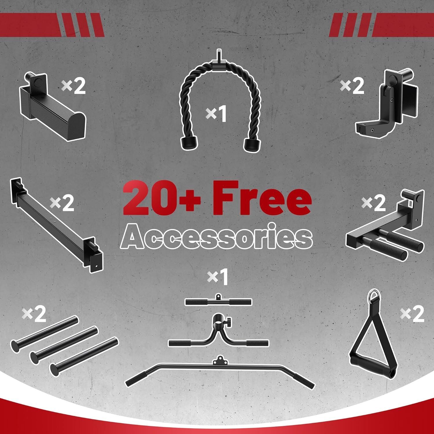 【20+ Free Accessories】 No need to buy additional fitness accessories; all are included with our ARMAC home gym equipment. This includes: 1 Lat Pulldown Bar, 1 Cable Bar, 2 Multi-position Cable Handles, 2 J-Hooks, 2 Safety Bars, 2 Wide/Narrow Parallel Bars, 1 360° Landmine, 1 Foot Pedal, 1 Battle Rope Ring, 6 Strap Spikes, 2 1″ and 2″ Barbell Clamps, and Weight Plate Holders.